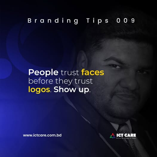 “মানুষ লোগোর আগে মুখে বিশ্বাস করে। তাই নিজেকে সামনে আনুন।” ব্র্যান্ড মানে শুধু একটা লোগো না।একটা লোগো তখনই বিশ্বাসযোগ্য হয়, যখন তার পেছনে একটা “মানুষ” থাকে। মানুষ সম্পর্ক তৈরি করে মানুষের সাথে, না যে লোগোটা ঘুরে ঘুরে দেখছে,না যে কালার…