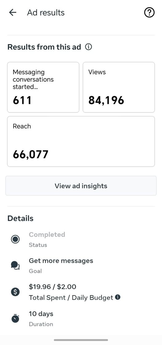 ডেইলি ব্জেট মাত্র ২ ডলার। মোট বাজেট ২০ ডলার, ১০ দিনের জন্য। পোস্ট ভিউ – ৮৪,১৯৬ জন। পোস্টের রিচ ৬৬,০৭৭ জন। CPM – Cost per message – 0.03 বিশ্বের যেকোন প্রান্তে,যেকোন প্রোডাক্ট বিবেচনায় এই এড বেস্ট এড এবং সেটাই সবাই…